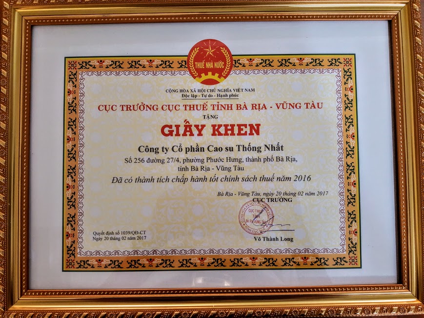 Công ty CP Cao su Thống Nhất được trao Giấy khen về Thành tích nộp thuế trong năm 2016 + 2017